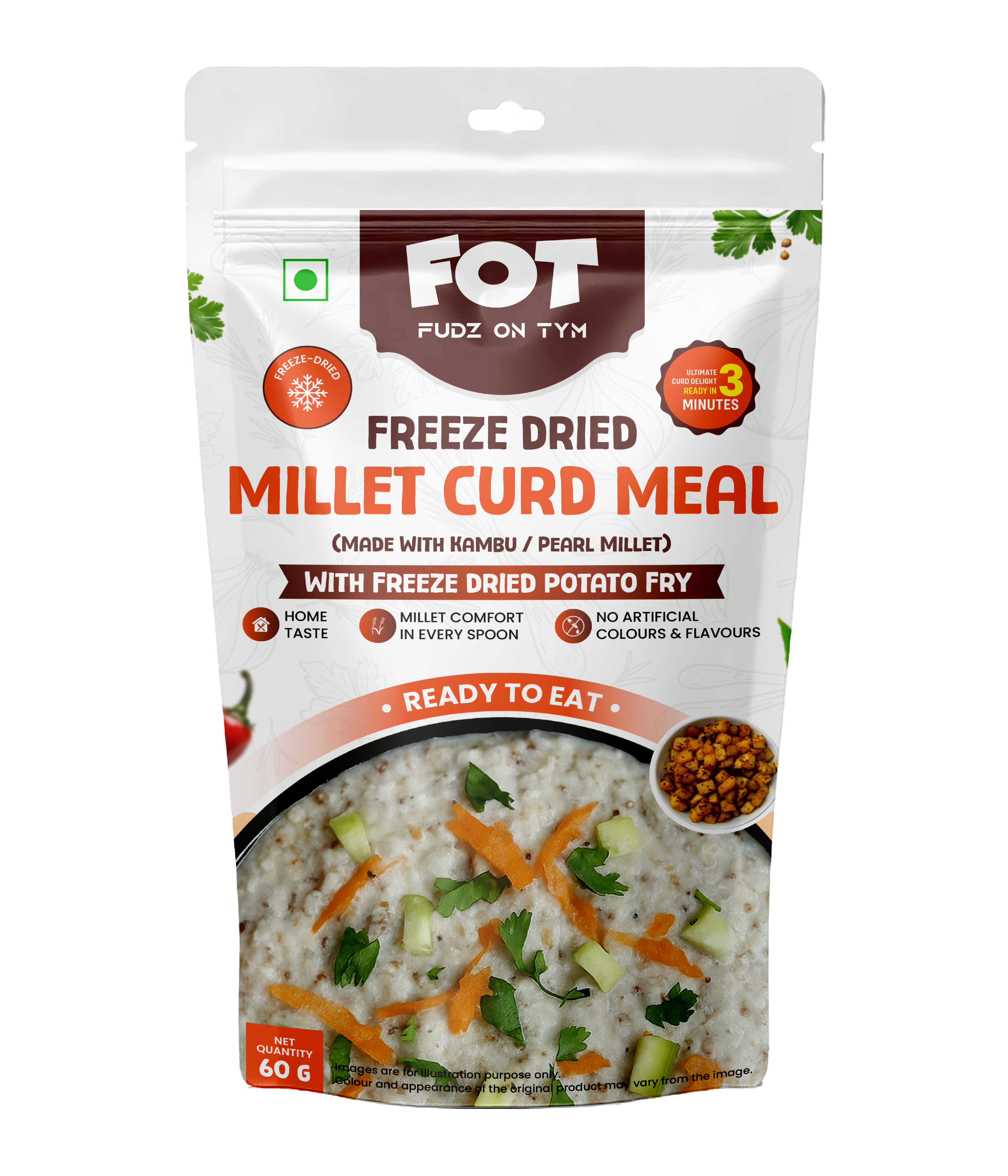Millet Curd Meal: Curd (57%), Pearl Millet (24%), Milk (9.5%), Cashew Nut, Dry Grapes, Salt, Fresh Cream, Edible Vegetable Oil (Coconut Oil), Green Chilli, Ginger, Curry Leaves, Split Urad Dal and Mustard Seed. |