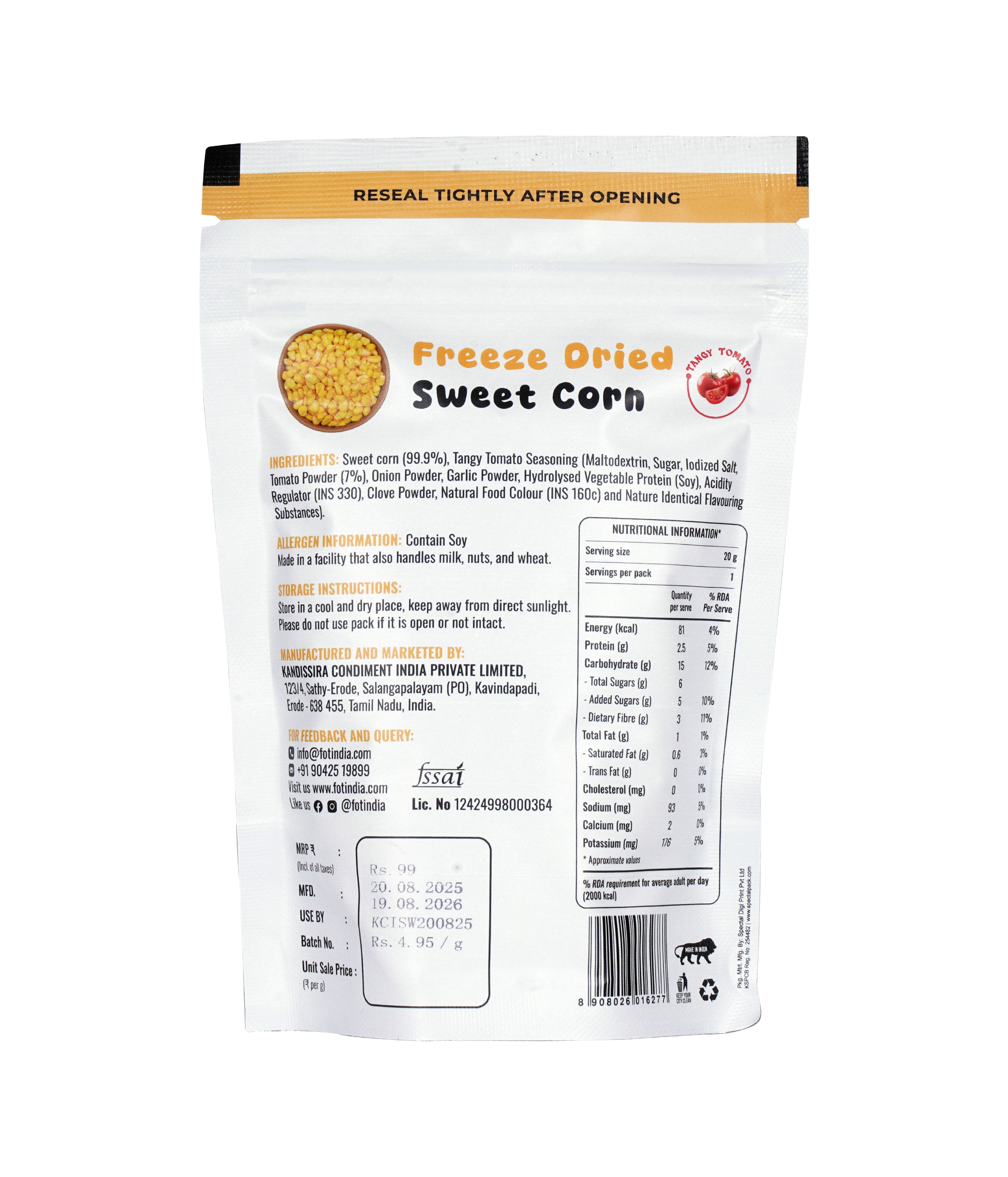 Sweet corn (99.9 %), Tangy Tomato Seasoning (Maltodextrin, Sugar, Iodized Salt, Tomato Powder (7%), Onion Powder, Garlic Powder, Hydrolysed Vegetable Protein (Soy), Acidity Regulator (INS 330), Clove Powder, Natural Food Colour (INS 160c) and Nature Identical Flavouring Substances). |